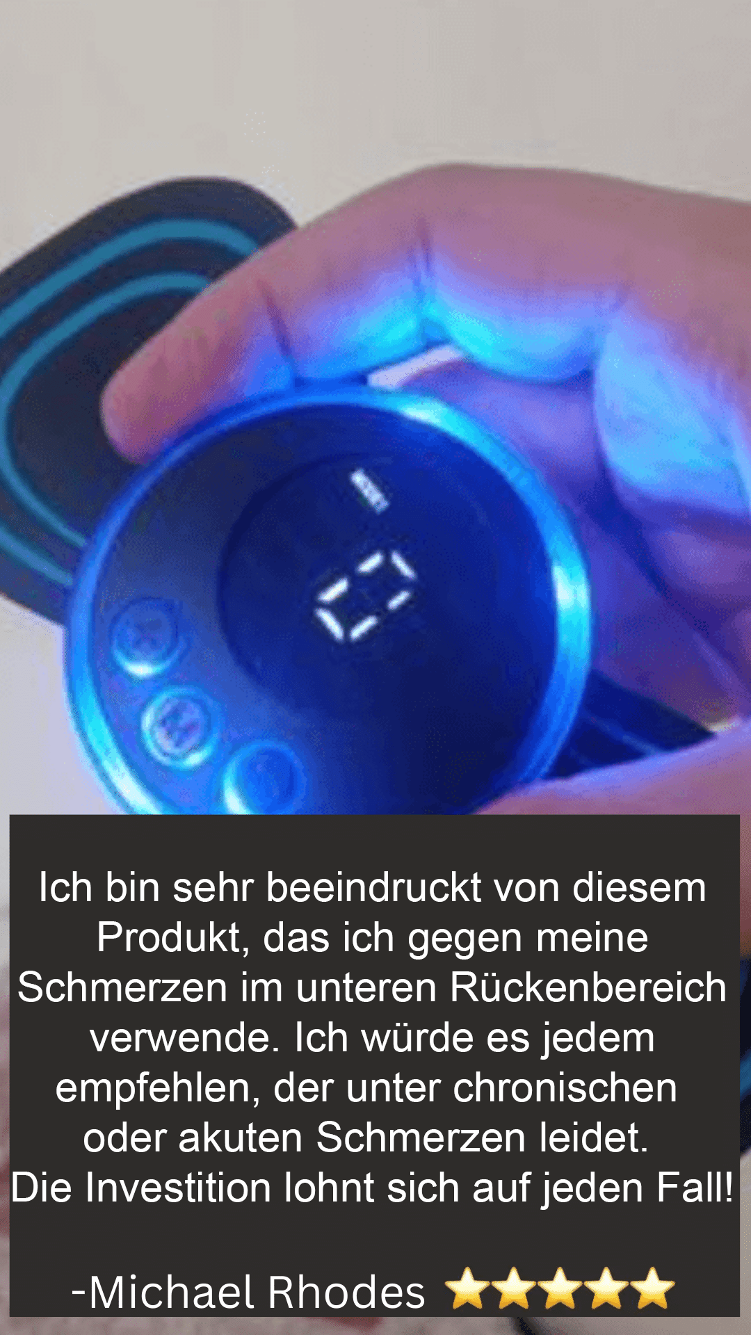 „Ich bin sehr beeindruckt von diesem Produkt, das ich gegen meine Rückenschmerzen verwende. Ich würde es jedem empfehlen, der unter chronischen oder akuten Schmerzen leidet. Die Investition lohnt sich auf jeden Fall!“